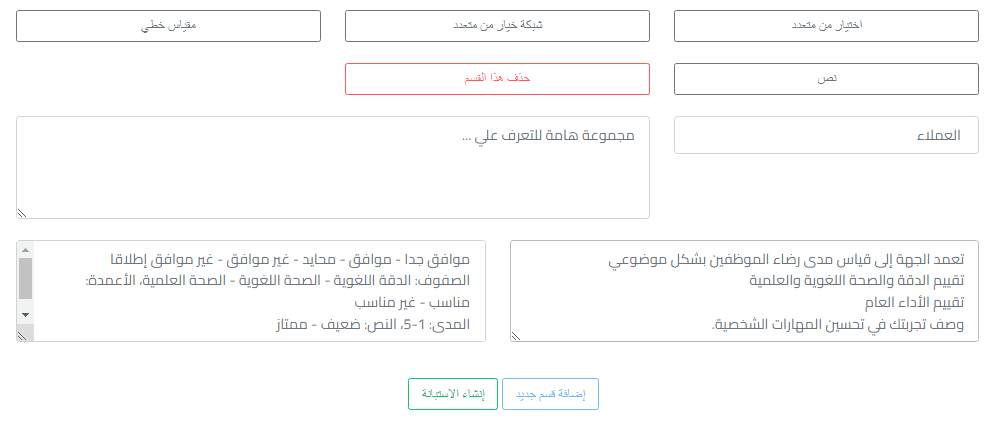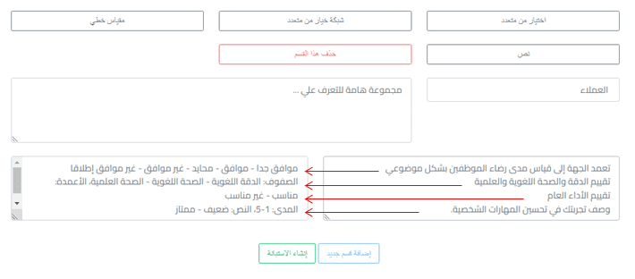 - تحديد المربعات: والتي تتيح إمكانية اختيار أكثر من إجابة في ذات الوقت. تقييم، من 1 إلى (عددٍ يختاره المستخدم)كمثال ,صندوق نصي, فقرات.